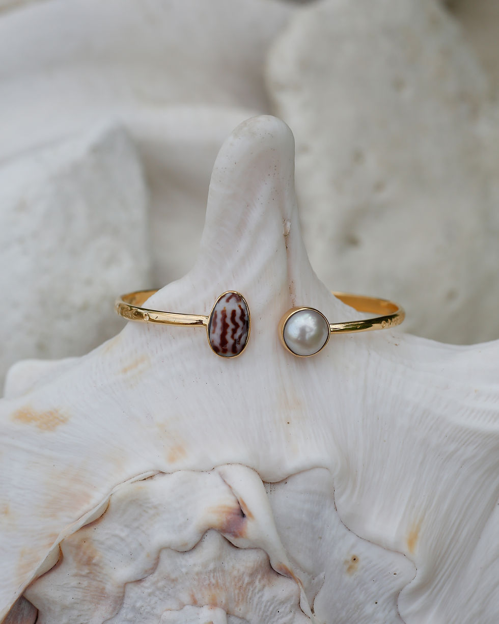 Handmade shell cuff bracelets. Made out of brass and gold plated with thick layer of 18k gold. Shells from Mentawai Islands, paired with fresh water pearls or Australian opals.